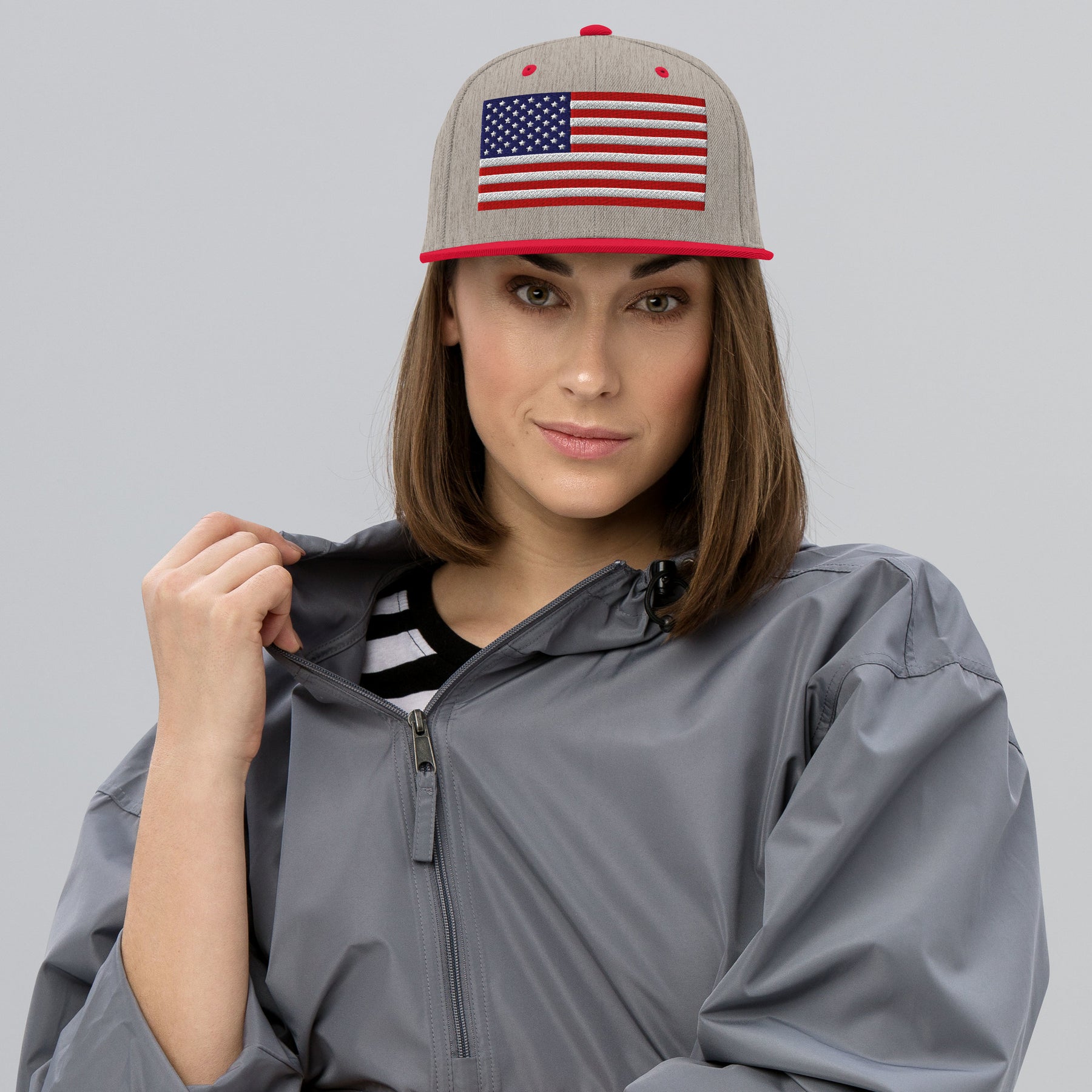 Show your patriotic spirit with our American Flag Snapback Hat. This classic hat boasts a structured, 6-panel, high-profile design with a flat brim and full buckram, creating a clean and sharp silhouette. It’s the perfect way to display your love for the USA with a timeless and iconic look.