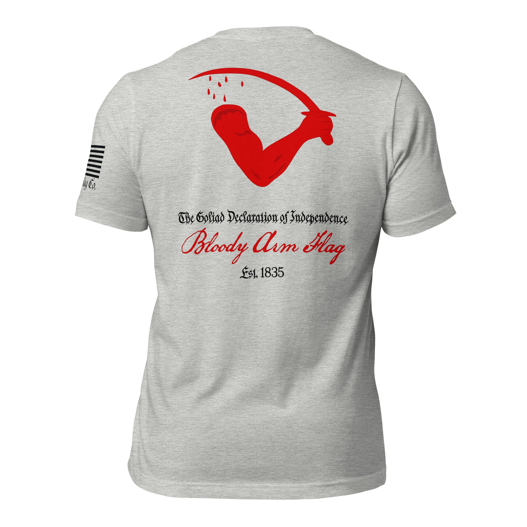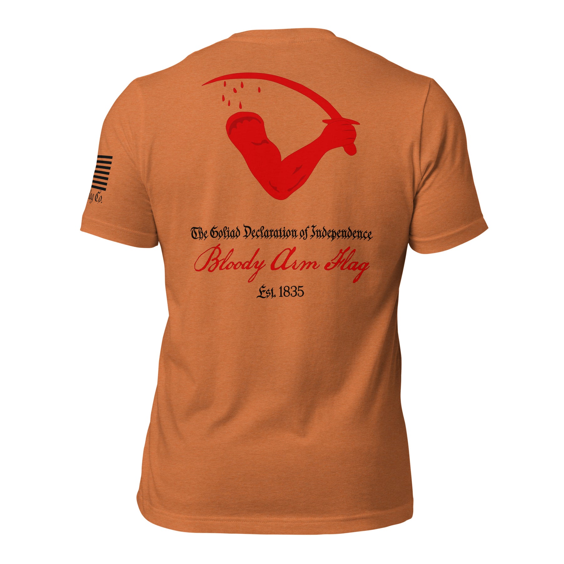 Dive into a pivotal moment of Texas history with our Goliad Flag aka Bloody Arm Flag T-shirt, a powerful tribute to the Goliad Declaration of Independence. This iconic flag, raised in 1835, was a bold statement of defiance, featuring a bloody arm and a dagger that symbolized the readiness to fight for freedom. Crafted with high-quality DTG (Direct-to-Garment) printing, the historic design is infused directly into the fabric, creating a soft, vintage feel. Unlike other methods, DTG printing ensures this unique piece of history won't crack, peel, or fade, so its story endures just like the spirit of Texas.